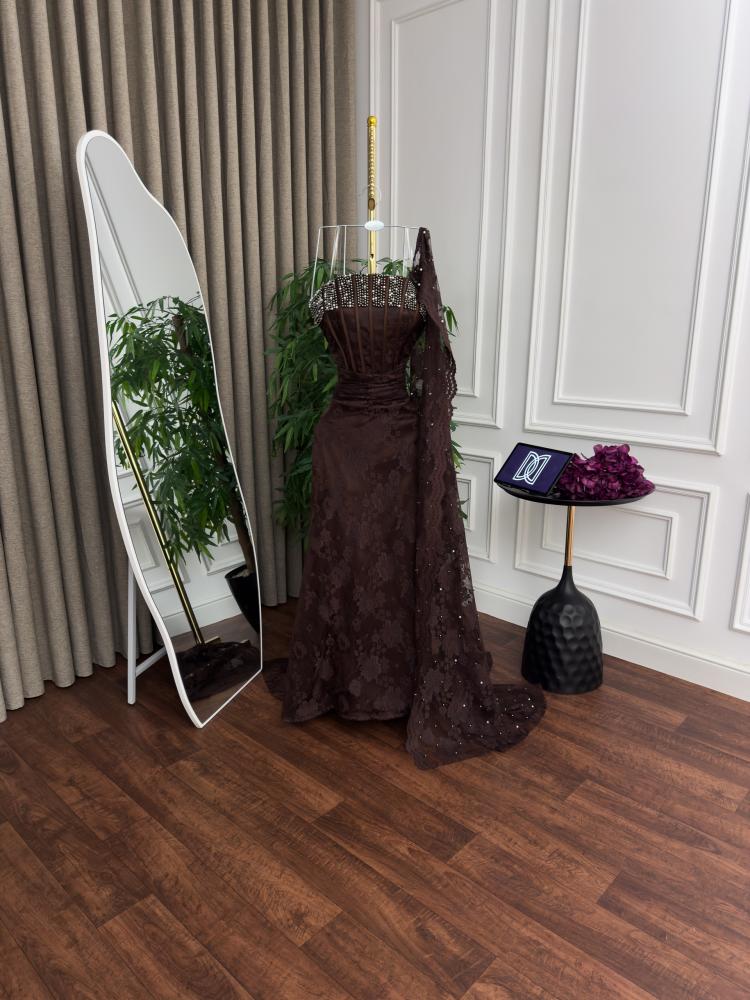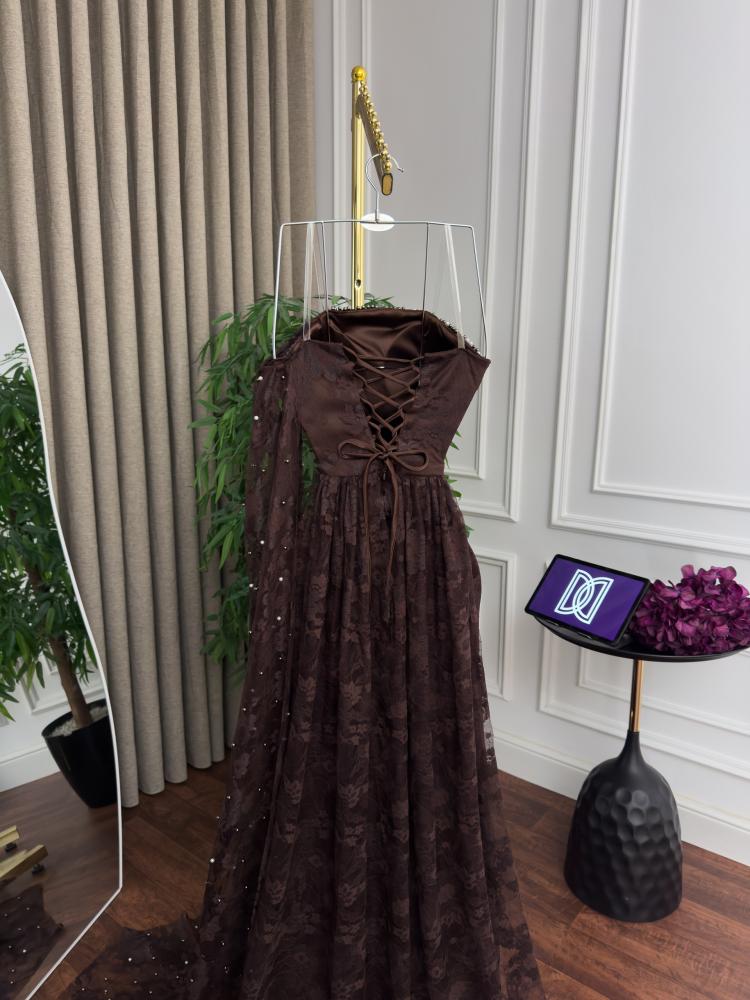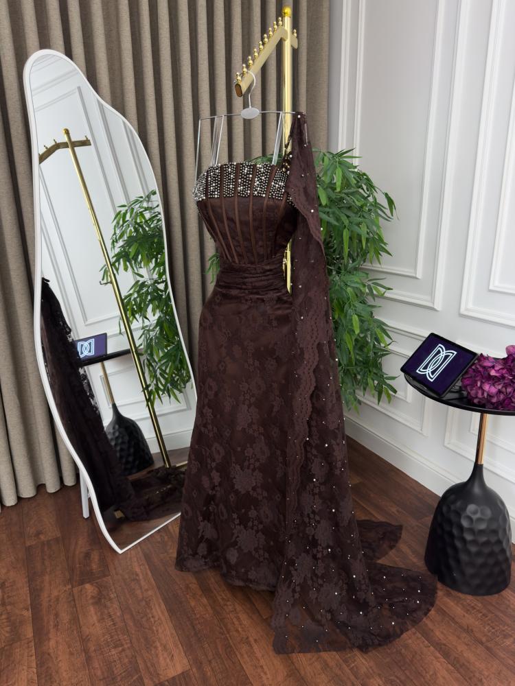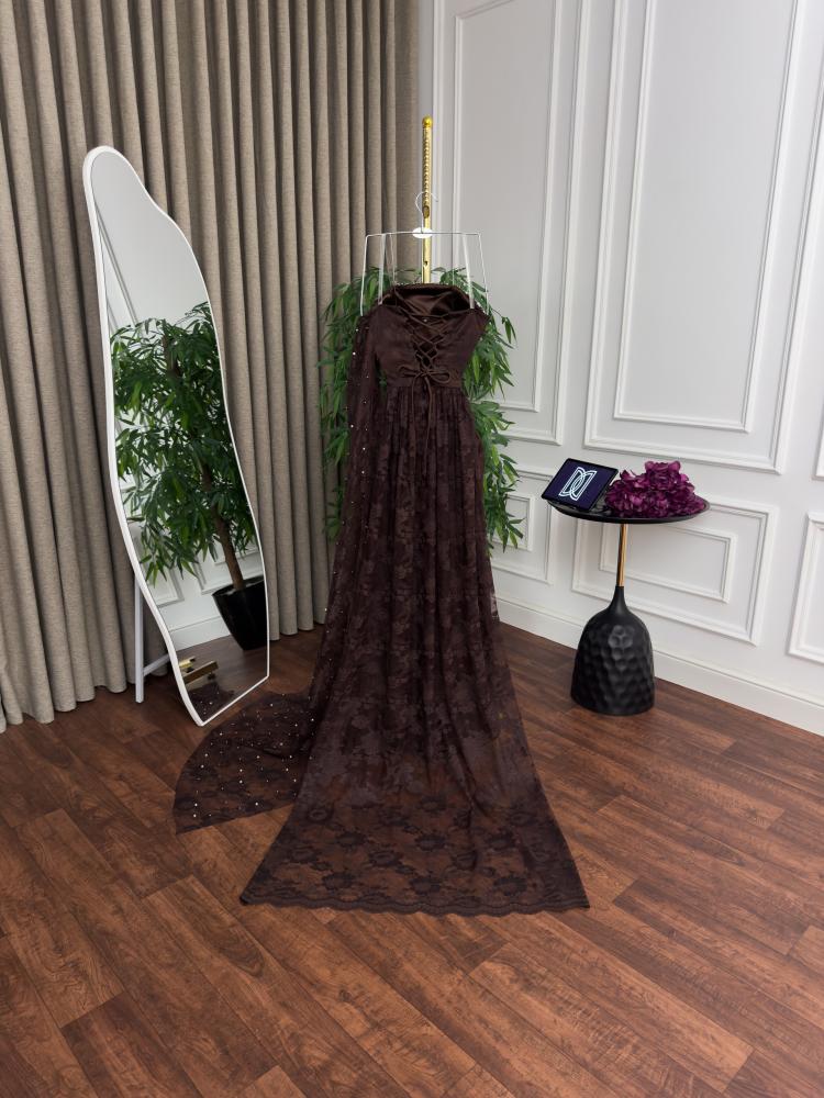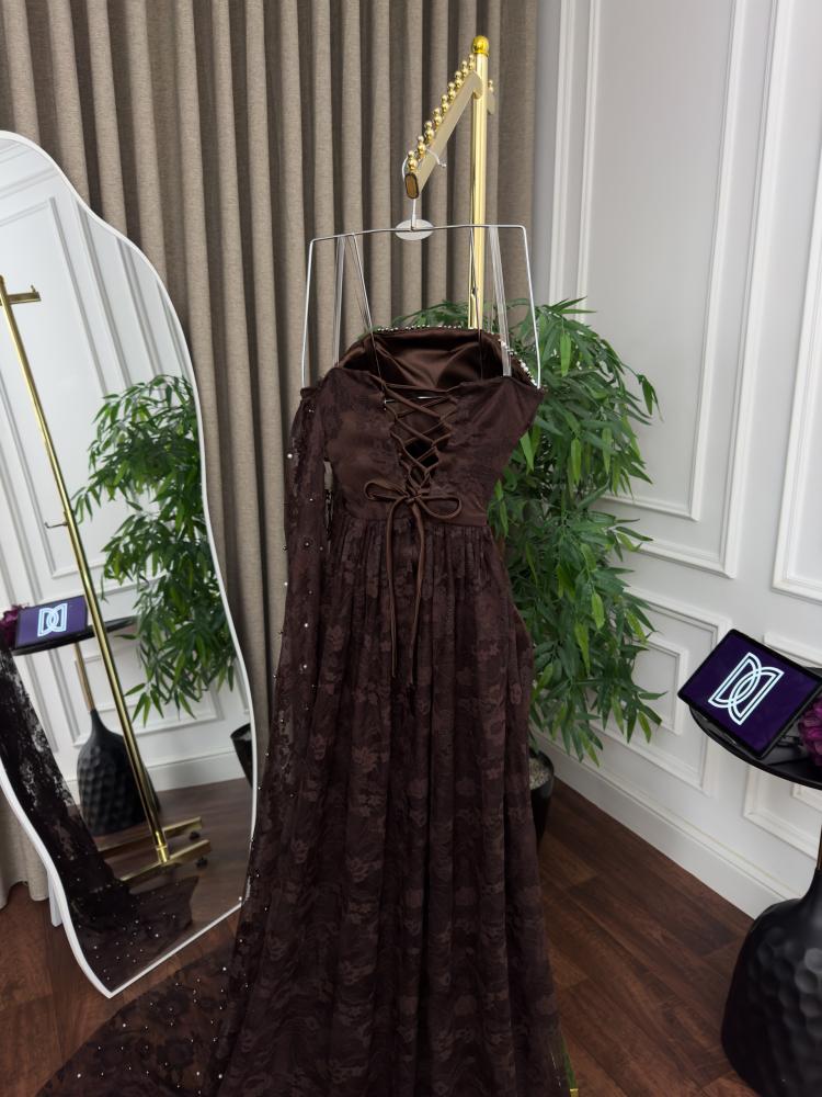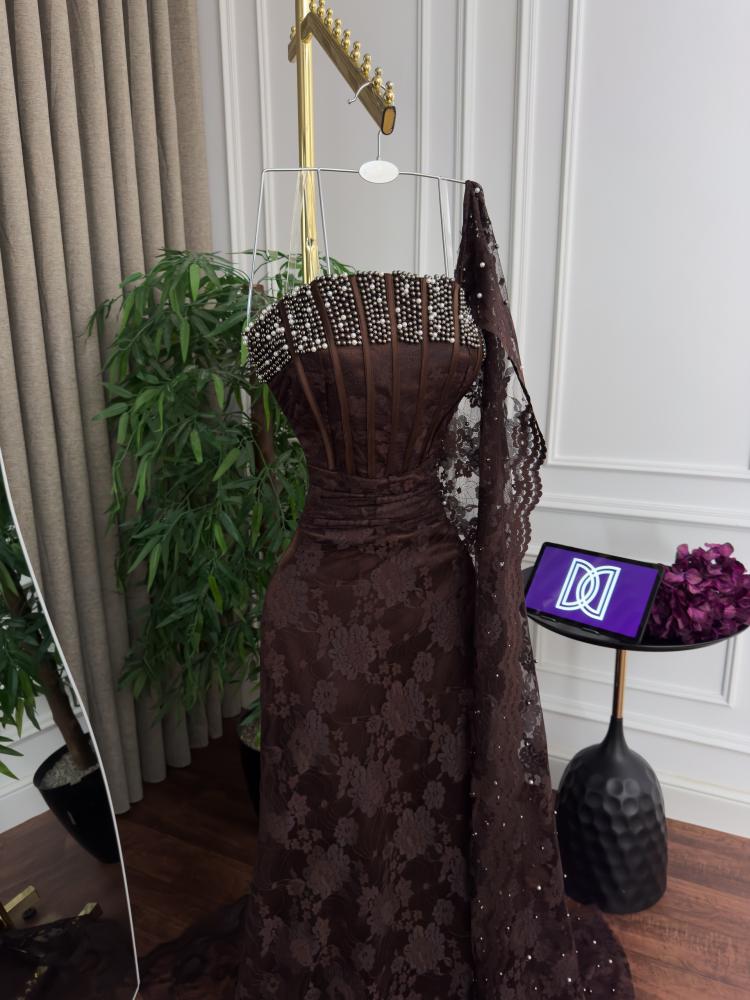 فستان سهرة بني من ريفال ليدي استمتعي بإطلالة ملكية ساحرة مع فستان سهرة دانتيل لول الذي يجمع بين فخامة الدانتيل وتفاصيل اللؤلؤ البراق ليمنحك حضوراً استثنائياً في أرقى المناسبات.