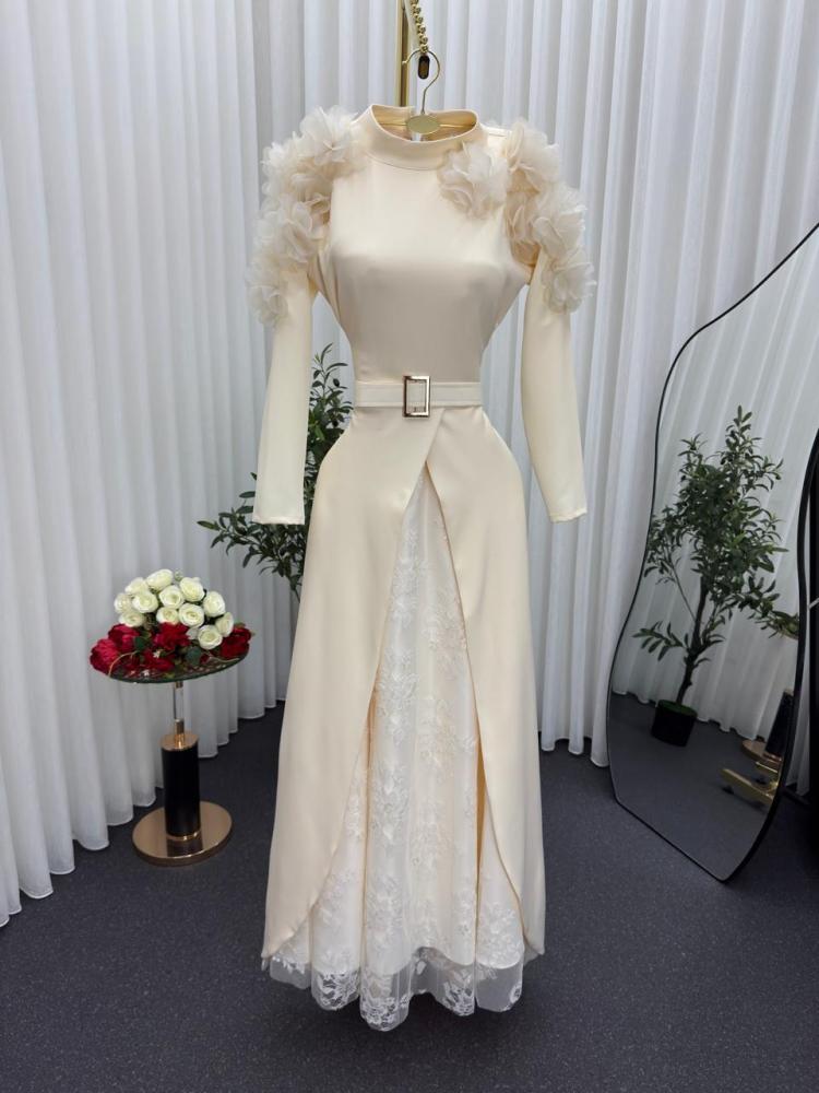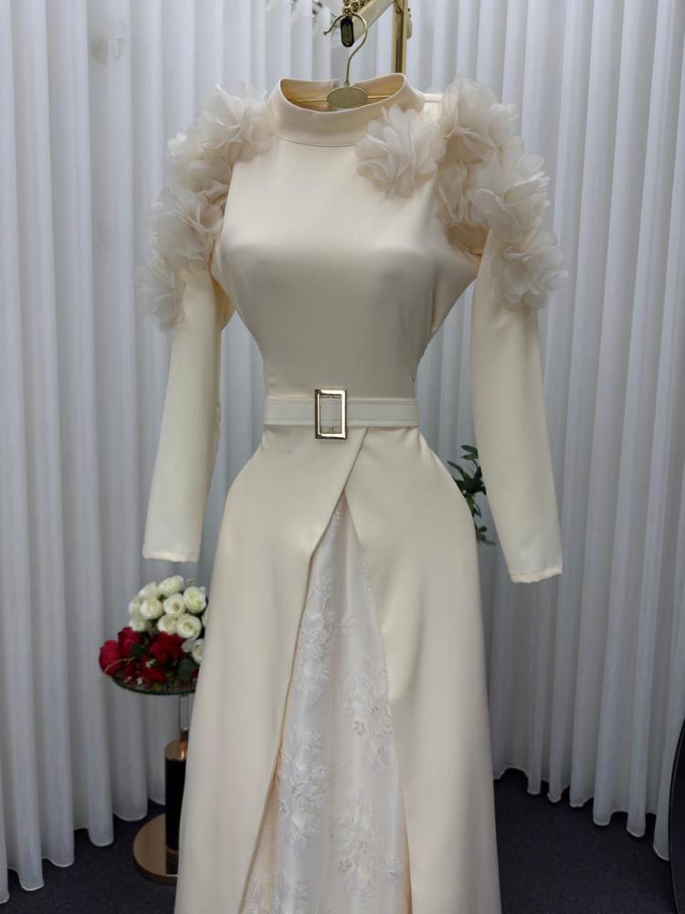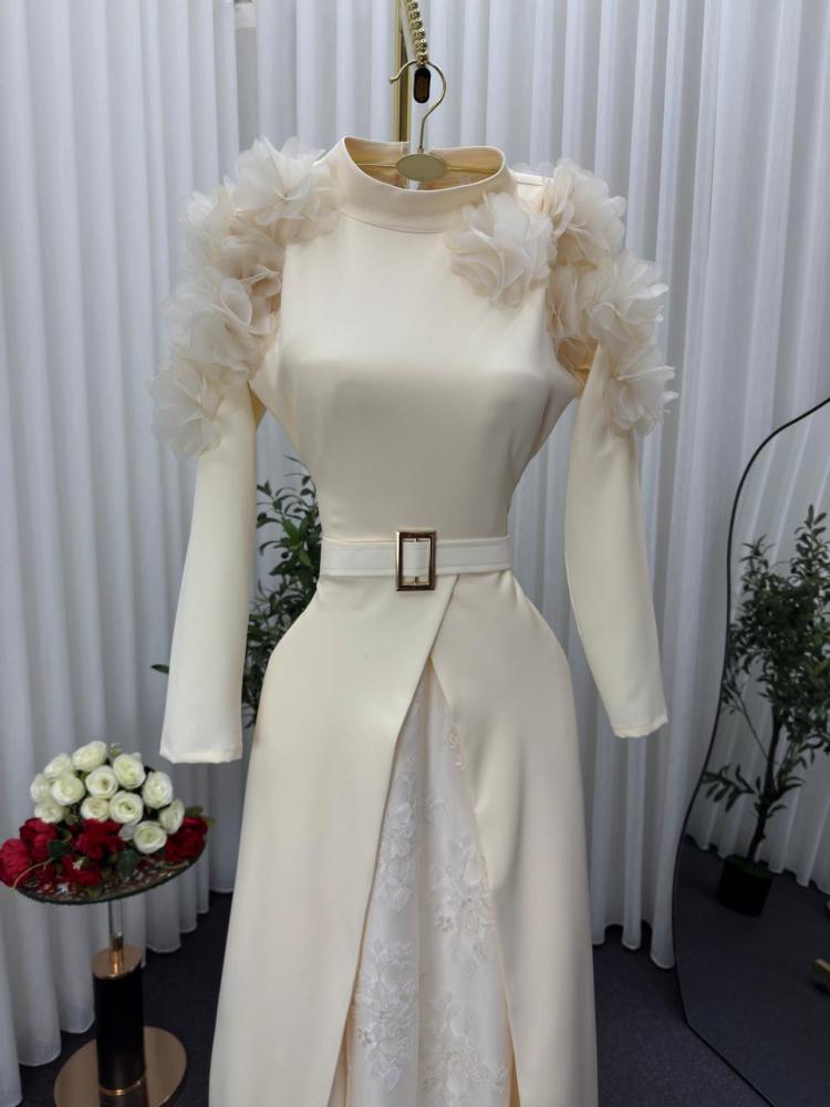فستان سهره ابيض من ريفال ليدي يمزج بين رقة اللون الكريمي وفخامة التفاصيل المشغولة يدوياً ليمنحك حضوراً مشرقاً في مناسباتك.