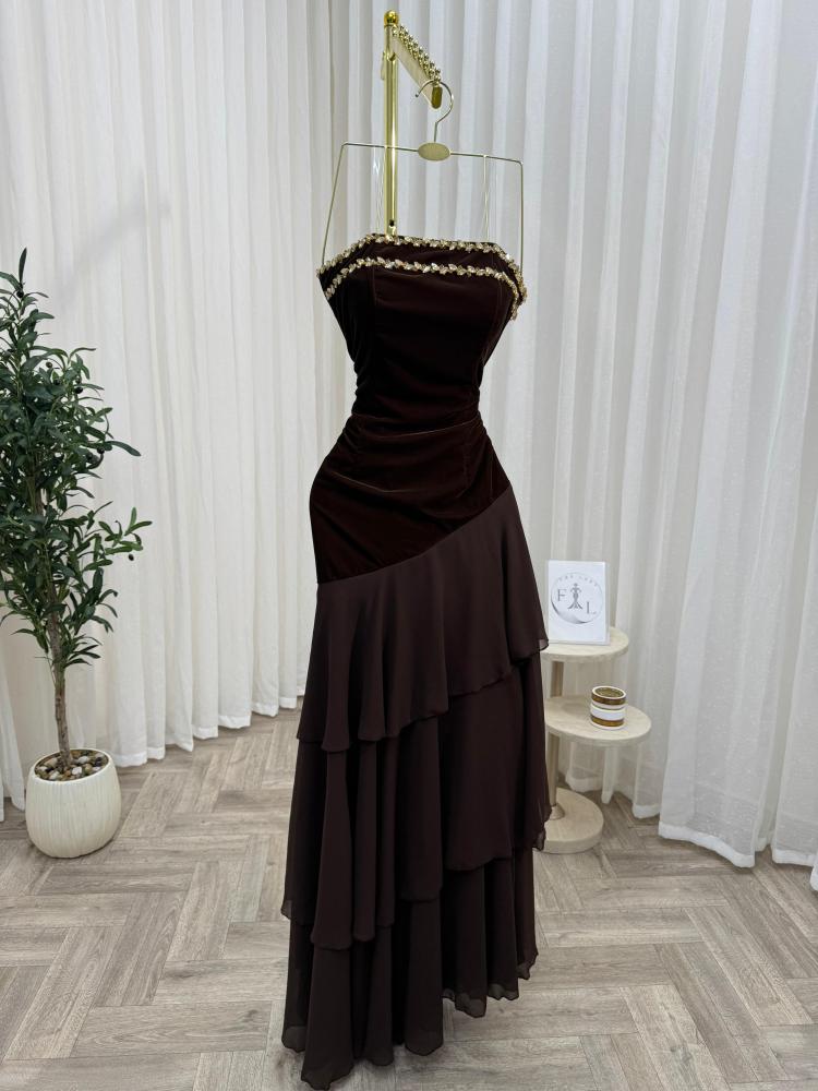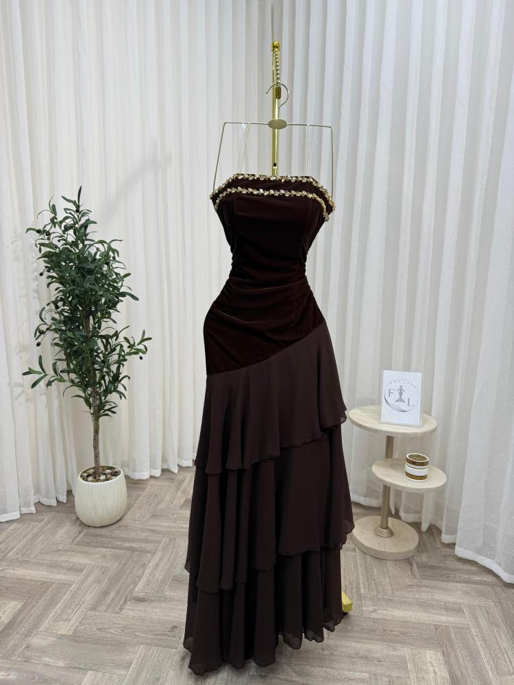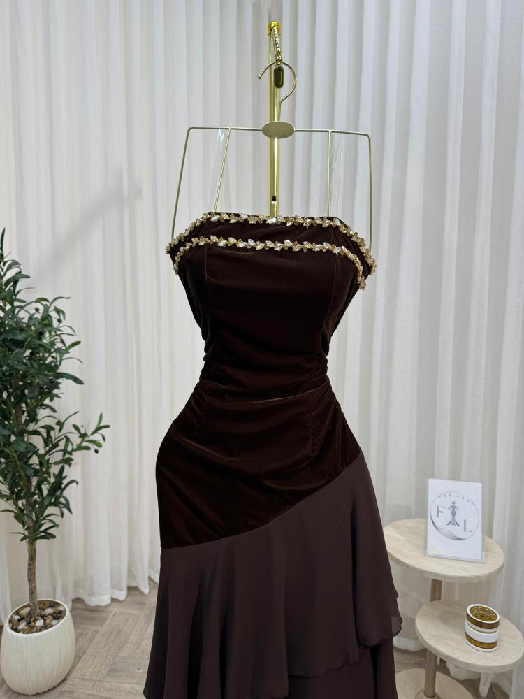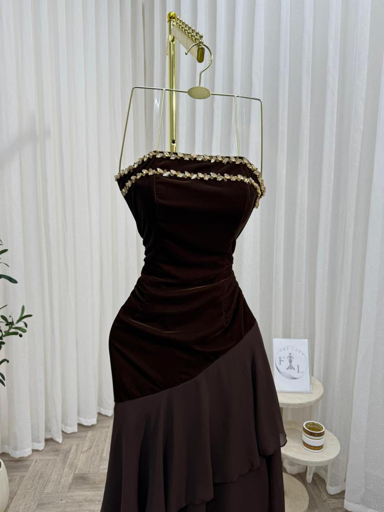 فستان سواريه بني من ريفال ليدي تألقي بإطلالة كلاسيكية ساحرة مع فستان سهرة مخمل وجورجيت الذي يمزج بين فخامة المخمل وانسيابية طبقات الجورجيت ليمنحك مظهراً أنثوياً متكاملاً في مناسباتك الراقية.